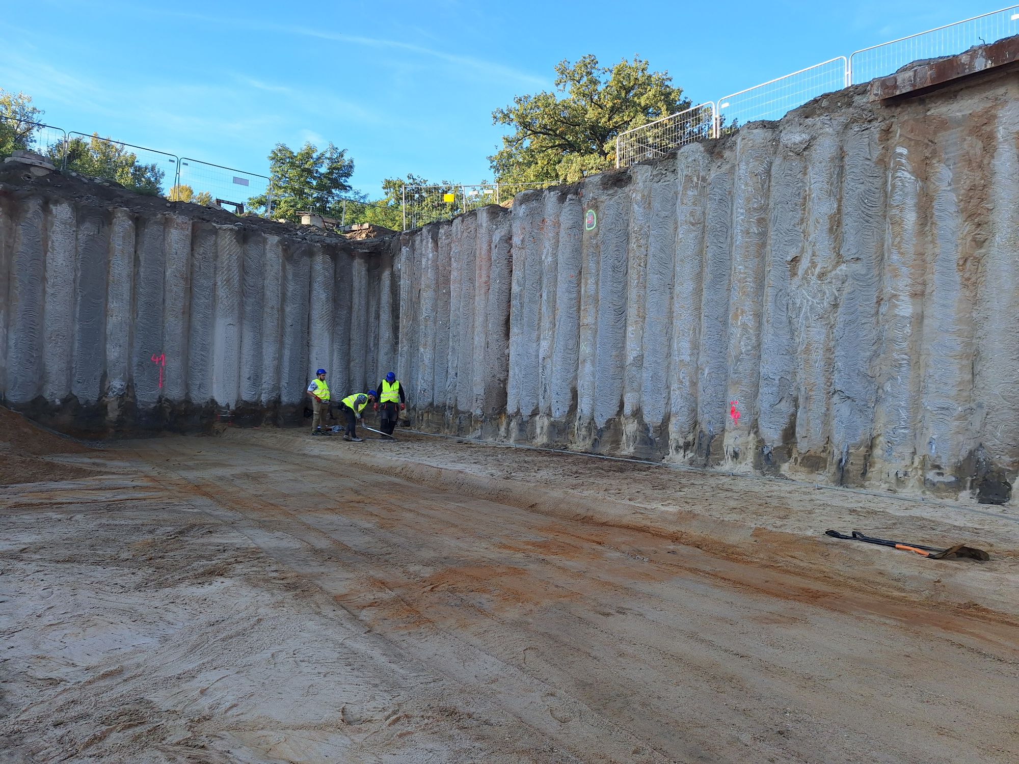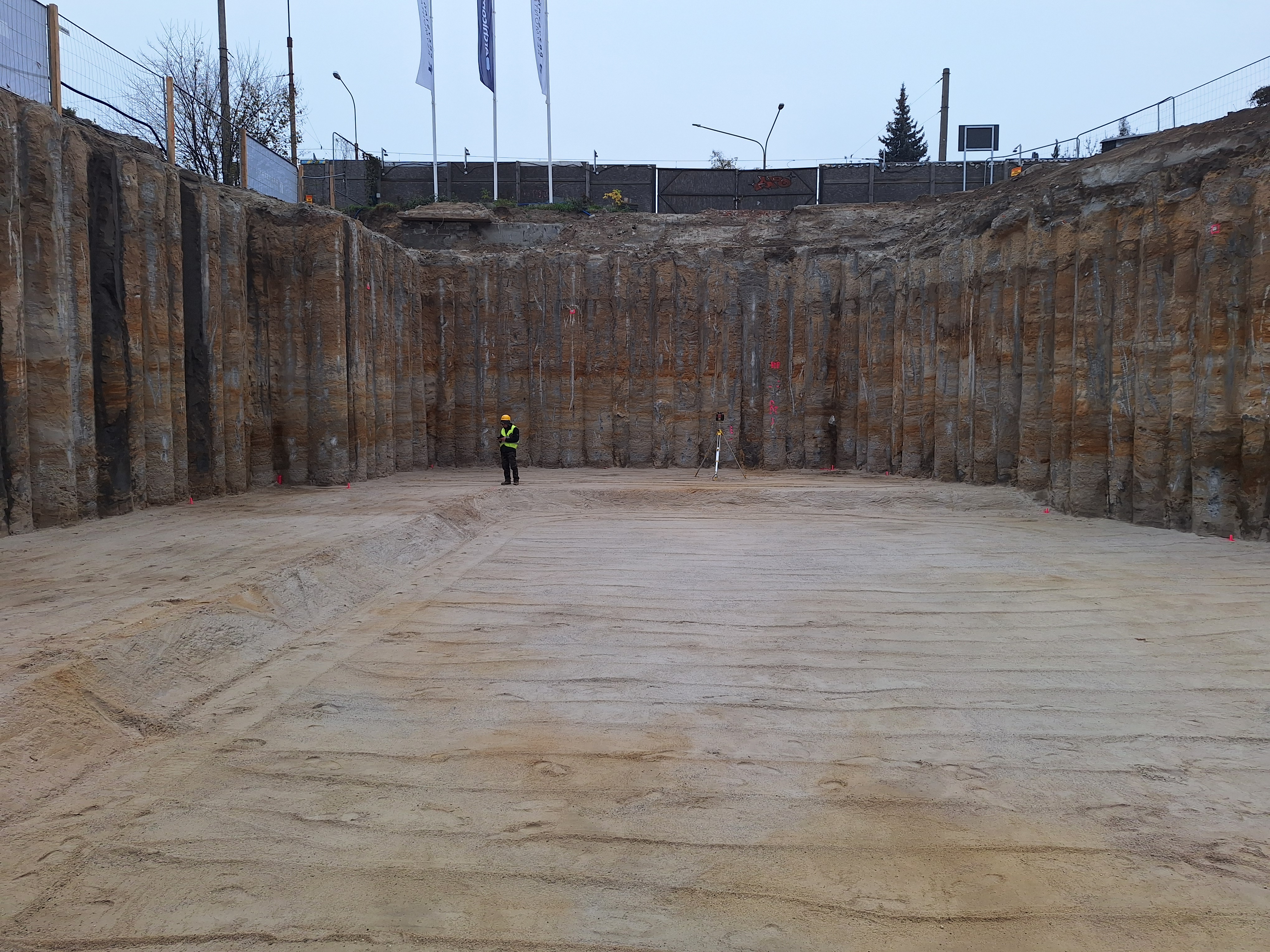 Kluczowym elementem całej realizacji była palisada wspornikowa, która osiągnęła parametry rzadko spotykane w budownictwie mieszkaniowym. Zastosowaliśmy pale o średnicy 880 mm, z zazębieniem sięgającym około 50 cm, posadowione na głębokości nawet 8-9 metrów poniżej dna wykopu. Aby podnieść bezpieczeństwo dodatkowo wwierciliśmy je w warstwy piasku i gliny. Dzięki temu woda z Odry nie mogła ich „obejść”, co pozwoliło prowadzić roboty w otwartym wykopie, bez rozparć i bez ingerencji w otoczenie. Weryfikacja tego rozwiązania nastąpiła w praktyce we wrześniu 2024 roku. Podczas gdy Wrocław zmagał się z falą kulminacyjną po intensywnych opadach deszczu, nasz wykop nie ucierpiał w żaden sposób. Wszystko zadziałało dokładnie tak, jak zakładano na etapie projektowym.