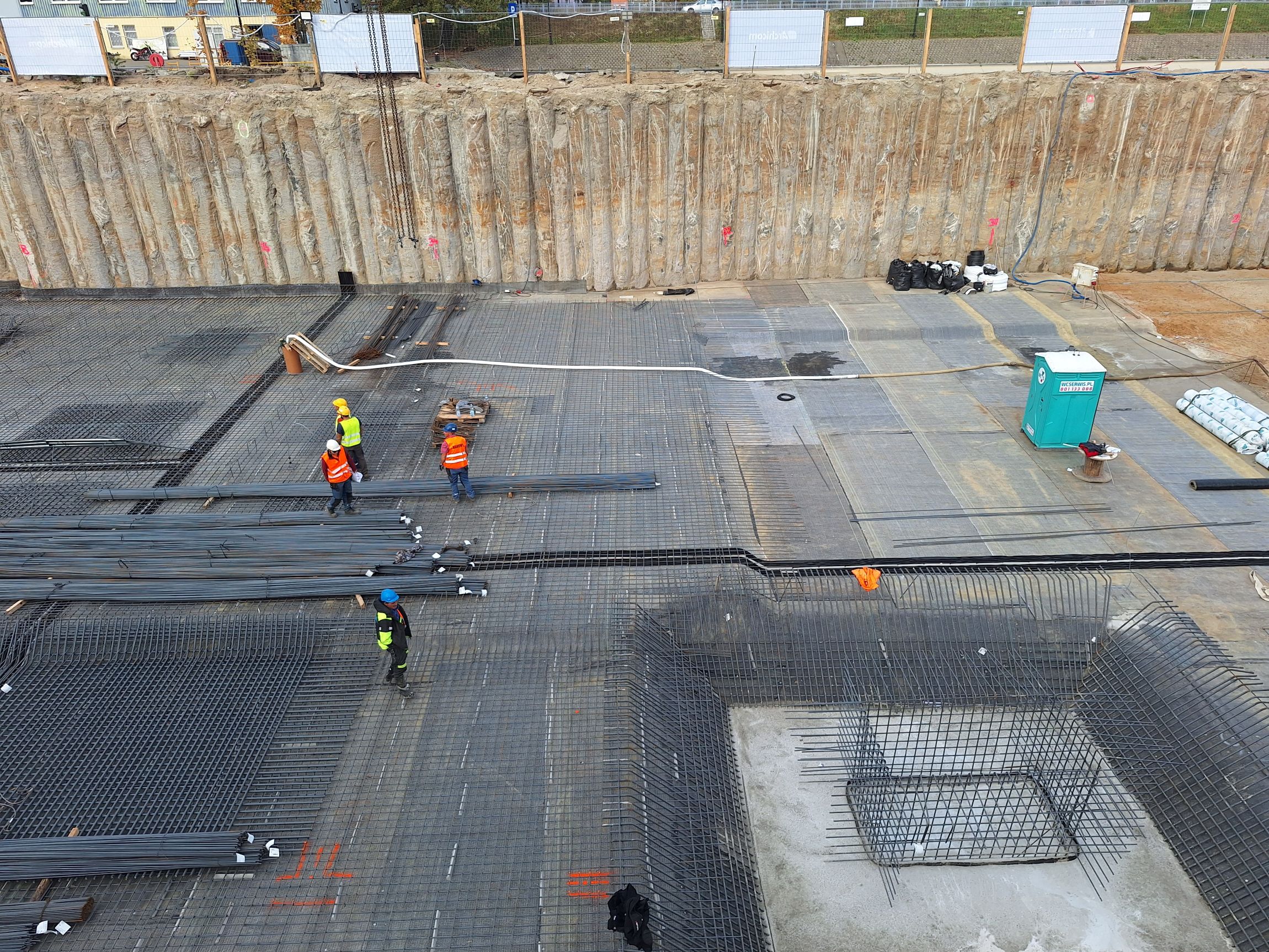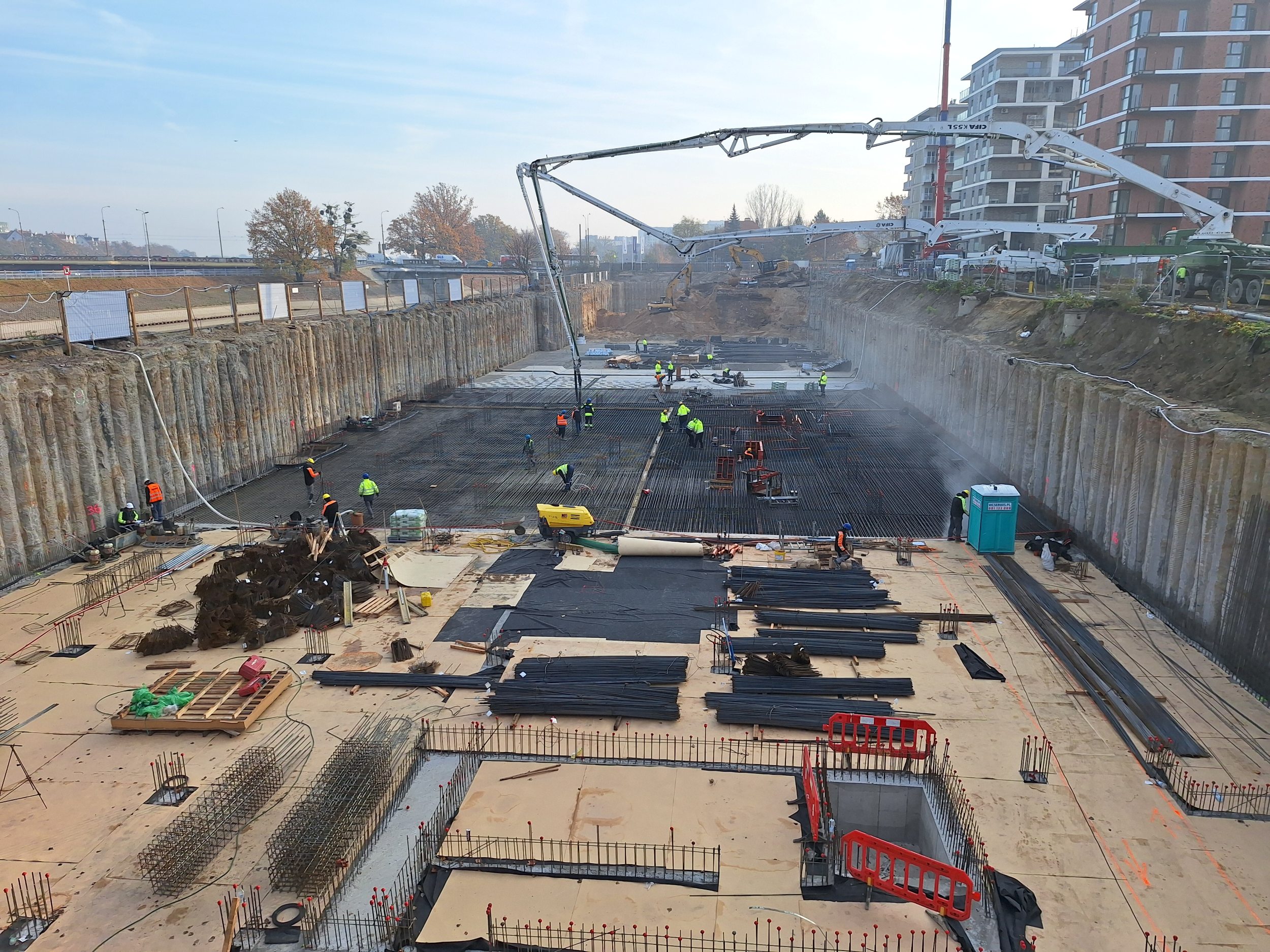 Podczas robót ziemnych kluczowym wyzwaniem było zarządzanie wodami gruntowymi. Każdego dnia z wykopu odpompowywano średnio około 2 tys. m³ wody, czyli równowartość blisko 10 cystern. Aby zapewnić szczelność i bezpieczeństwo konstrukcji, garaż wykonano w technologii tzw. białej wanny, z wykorzystaniem betonu wodoszczelnego. Podziemny obiekt posiada podwójną ochronę w postaci konstrukcji żelbetowej oraz systemu zabezpieczeń obwodowych.