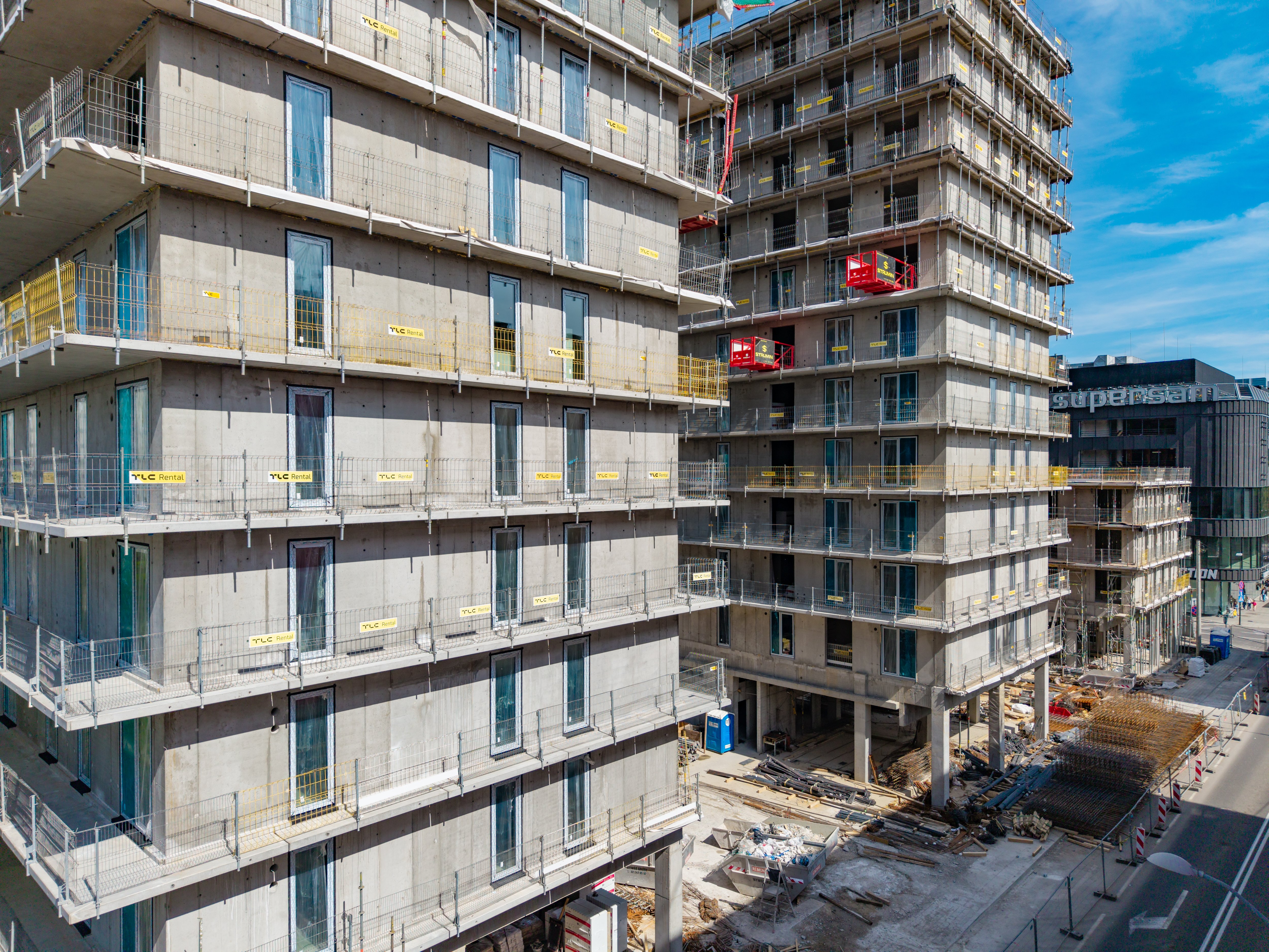 Na inwestycji prowadzone są zaawansowane roboty konstrukcyjne. Budynek A1 osiągnął 11. kondygnację z planowanych 16, A2 – 10. kondygnację z 14, a A3 – 3. kondygnację z 11. Równolegle realizowane są kolejne etapy prac. Trwa murowanie ścian działowych w budynkach A1 i A2 na kondygnacjach od 1 do 5, prowadzone są instalacje elektryczne i sanitarne w częściach podziemnych oraz mieszkaniach, a także montaż stolarki okiennej na niższych kondygnacjach. Zakończenie budowy planowane jest na czwarty kwartał 2026 roku.